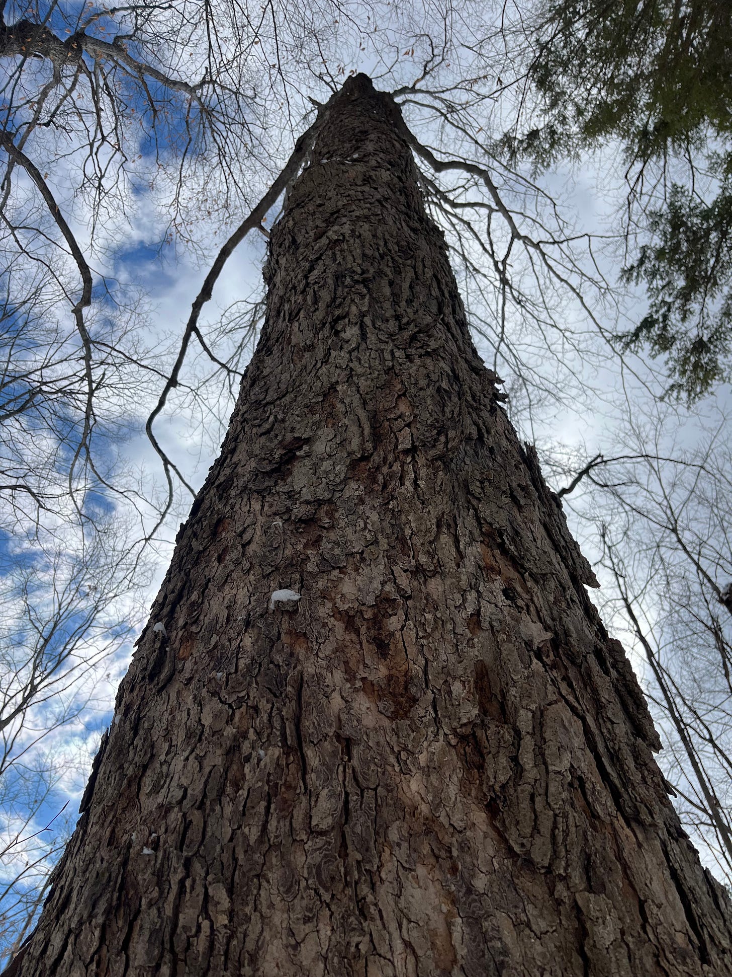 She—no question this tree is feminine—she soars for sixty or seventy feet before her strong arms reach out over the water toward the southern sky. She no longer has branches on the side of the shaded woods, though there’s evidence she once did, maybe before the forest grew up behind her.